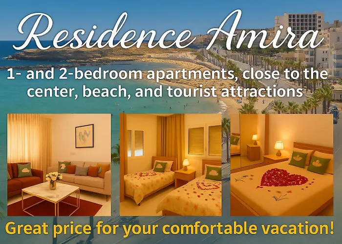Cosy Residence Amira dairesinde tam donanımlı mutfağın yanı sıra uydu kanallı düz ekran televizyon, çok kanallı televizyon, iklim kontrolü içeren odalar bulunmaktadır. Ribât bu konaklama tesisinden 2 km, Monastir Marina ise 2,1 km uzaklıkta bulunmaktadır.